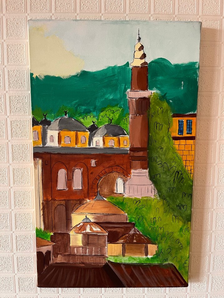 Kahverengi tonlarda, yeşil arka planlı şehir manzarası ve yüksek bir kule içeren canlı ve sanatsal tarzda tablo. Çocuk ressam yaptı. Bursayı anlatıyor. Akrilik