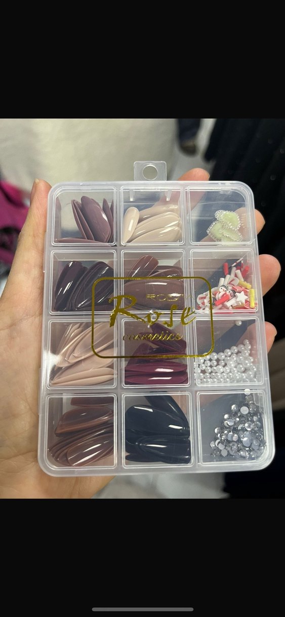 Kahverengi ve bej tonlarında tırnak uçları ile inci ve taş gibi çeşitli küçük süslemeler içeren şeffaf kutuda tırnak süsleme seti.