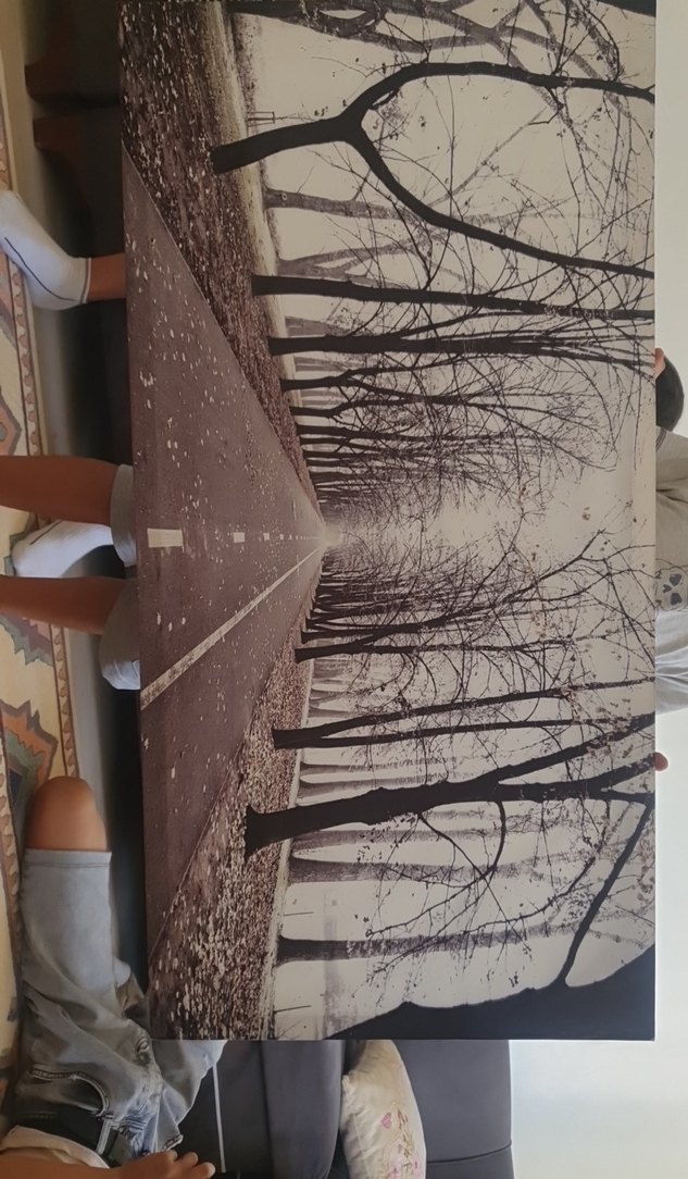 Bu tablo, kahverengi tonlarda yapraksız ağaçlarla çevrili bir yolu tasvir ediyor. Koyu renkler sahnenin derinliğini ve perspektifini vurguluyor. arkasında ışık var pili yok