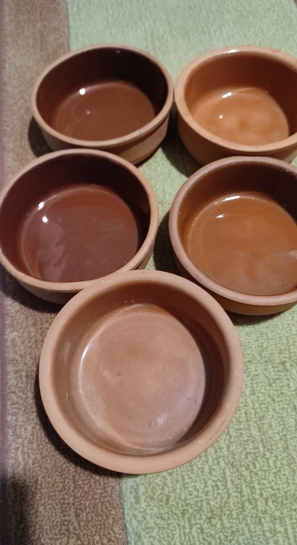 Yiyecek servis veya saklama için uygun, pürüzsüz yüzeyli koyu kahverengi toprak kaplar seti.