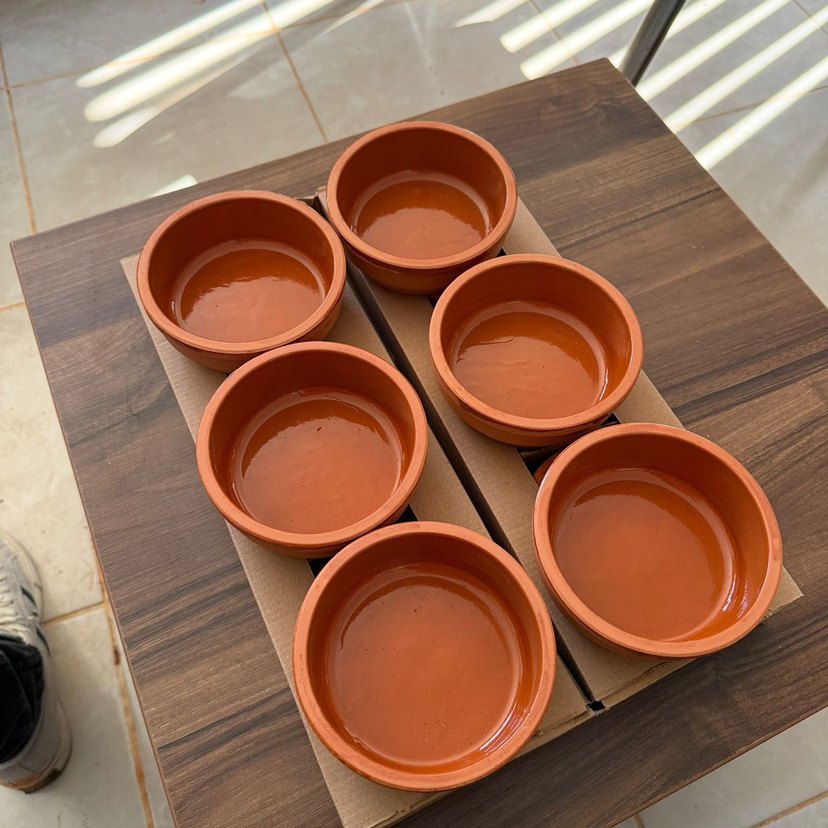 Altı adet koyu kahverengi toprak kaseden oluşan set. Yiyecek servisi için uygun, düz yüzeyli ve yuvarlak şekilli.