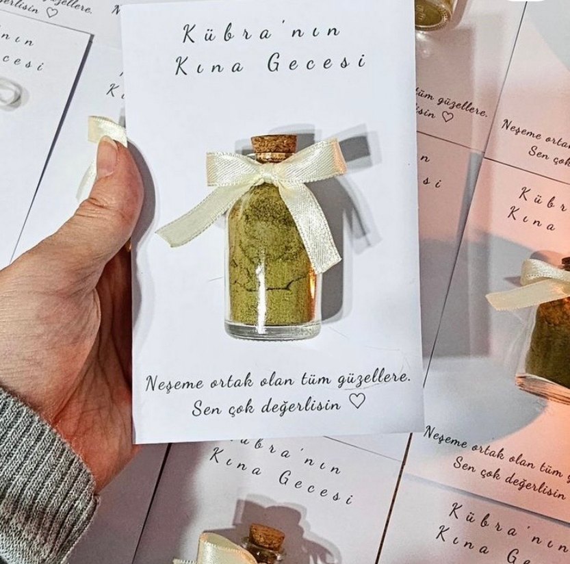 Küçük cam şişede mantar tıkaçlı ve kurdeleli açık kahverengi toz. Kına gecesi için özenle hazırlanmış. Kartlık değişkenlik gösterebilir .almadan önce fiyat alınız