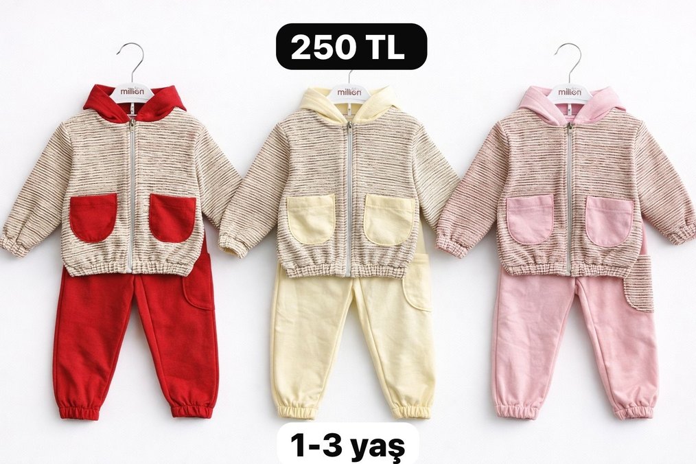 Kahverengi triko uzun kollu üstü, önden cepli ve fermuarlı, açık renk pantolonlu bebek kız takımı. 1-3 yaş arası için uygundur.