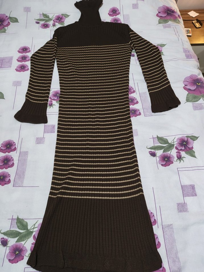 Kahverengi çizgili, boğazlı ve uzun kollu triko elbise. Esnektir. Standart beden ( L bedene kadar olur)