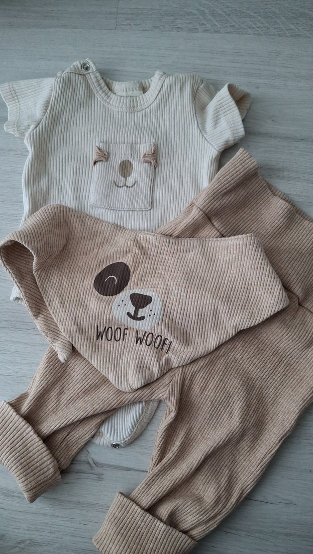 Kahverengi triko uzun kollu, yuvarlak yaka erkek bebek üstü ve üzerinde ayı yüzü cepli, WOOF WOOF baskılı kahverengi bandana ile takım pantolon içerir.