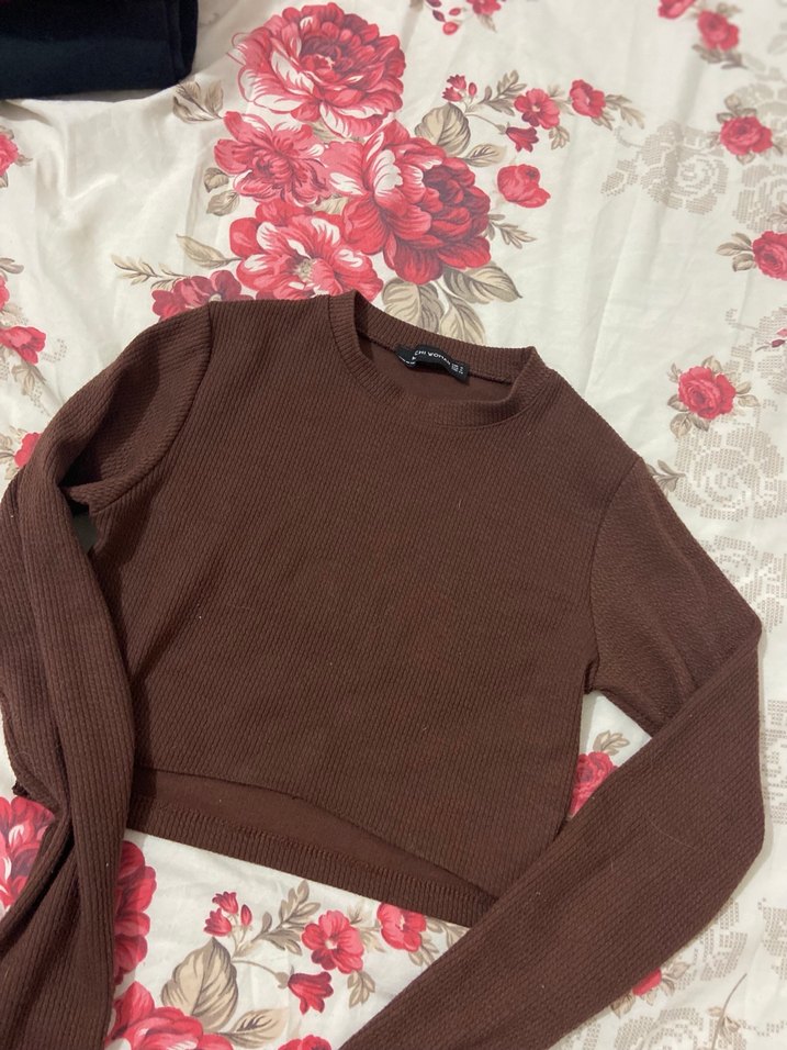 Dar kesim, uzun kollu ve yuvarlak yakalı kahverengi triko kadın kazak, yumuşak sentetik kumaştan örülüdür. Trendy günlük sokak stiline uygundur.