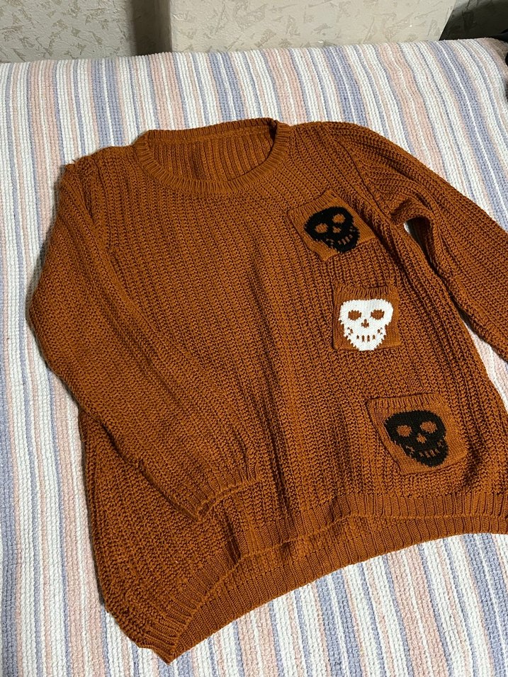 Kahverengi triko kadın kazak, uzun kollu ve yuvarlak yaka. Gevşek kesimli, siyah ve beyaz kafatası desenleriyle gotik tarzda. Yumuşak dokulu, rahat ve günlük kullanıma uygun. ☠️ Herhangi bir sorunu yoktur #kazak #emo