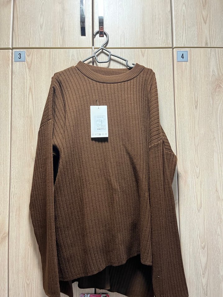 Kahverengi triko kazak, yuvarlak yaka ve uzun kolludur. Salaş kesimi ve normal midi boyuyla rahat bir kullanım sağlar. Desensiz, günlük kullanıma uygundur. Hiç kullanılmadı