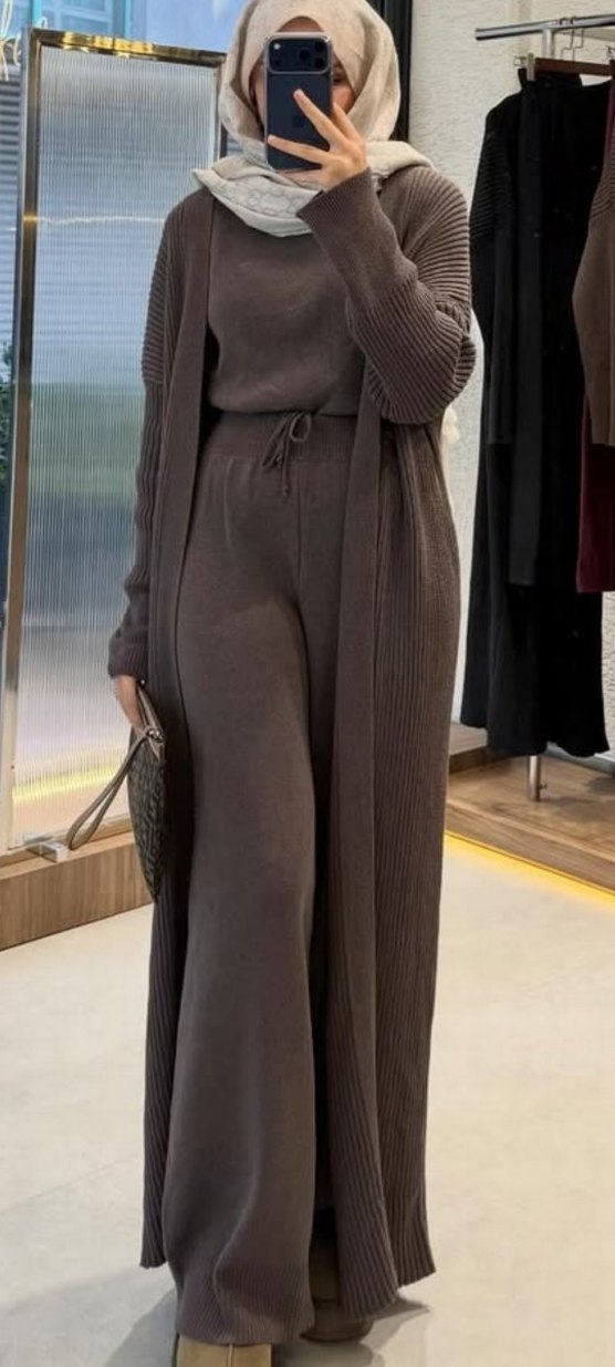 Kahverengi Triko Kadın Uzun Takım üç parça