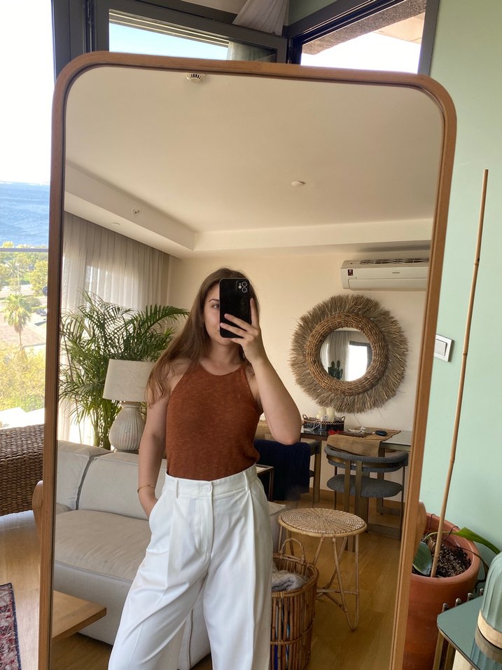 Kahverengi kolsuz triko bluz, yuvarlak yaka ve hafif bol kesimlidir. Örme dokusu, midi boyu ve minimalist tarzıyla günlük kullanıma uygundur.