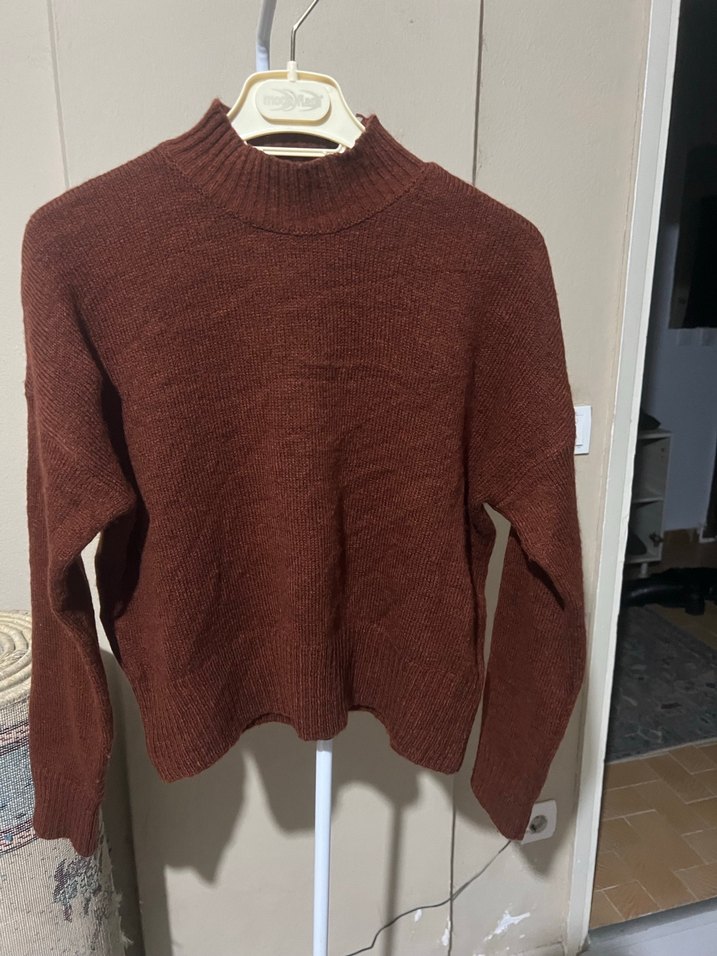 Kahverengi triko, yuvarlak yakalı, uzun kollu, bol kesim ve normal boyda kadın kazak. Yeni kullanılmadı