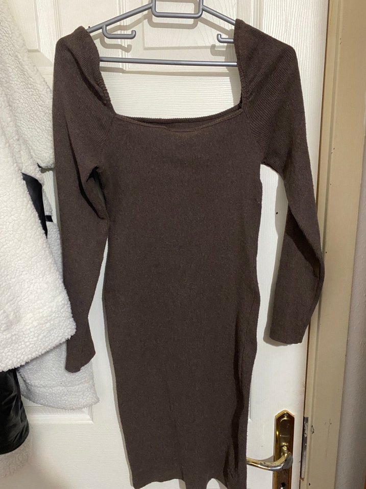 Koyu kahverengi, uzun kollu ve tek renk triko midi elbise. Yumuşak yün kumaştan, rahat ve günlük sokak tarzı için uygun.
