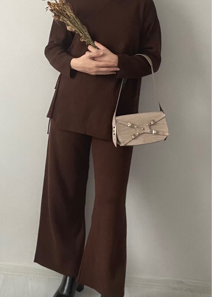 Çapraz bağlamalı kahverengi kalın kışlık triko takım