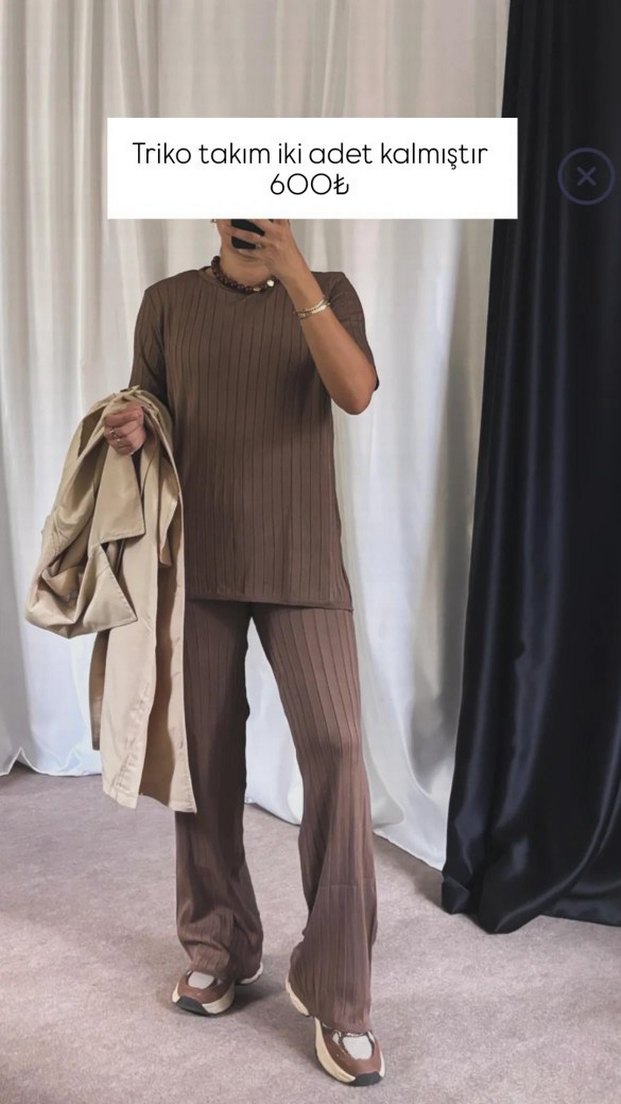 Kahverengi triko takım, yüksek yakalı ve kısa kollu, yumuşak kumaştan. Normal kesim, midi boy ve rahat şıklık sunar. Sadece iki adet kaldı, fiyatı 600₺. siyah ve krem rengi kalmıştır. standart bedendir.
