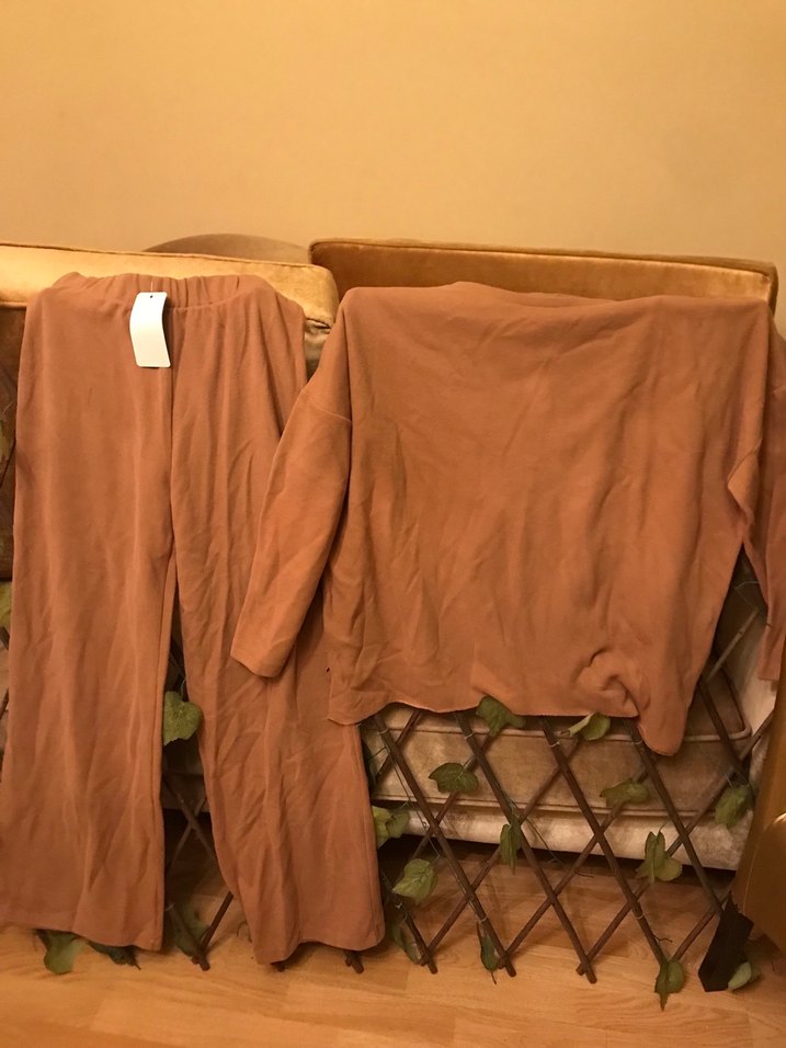 Koyu kahverengi, uzun kollu, yuvarlak yakalı triko takımı. Rahat kesim ve drapeli tasarımıyla normal boyda, konforlu bir model.