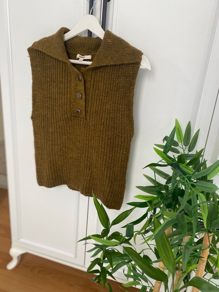 Kahverengi, yakalı, düğmeli ve salaş kesimli triko süveter. Midi boyda, rahat ve sıcak dokusu ile günlük sokak stiline uygun.