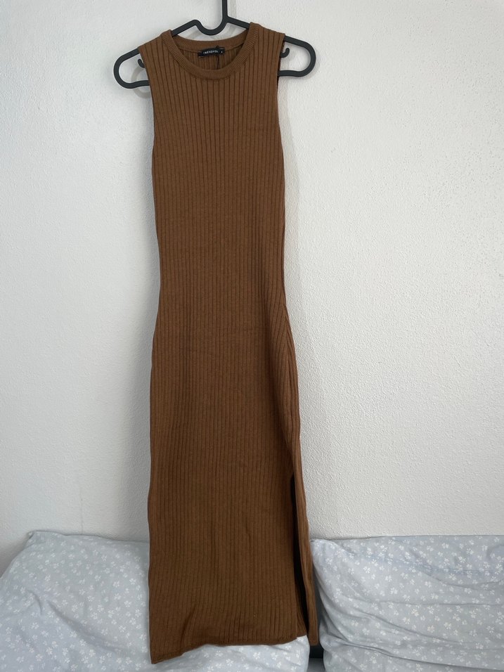 Kahverengi triko, yüksek yakalı, kolsuz ve vücuda oturan uzun elbise. Günlük kullanım için uygun, rahat ve trendy bir sokak stili parçası.