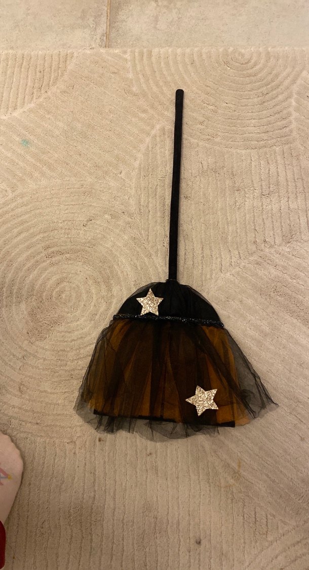 Kahverengi tül detaylı, simli yıldız süslemeli cadı süpürgesi. Koyu renk sapı ve eğlenceli tasarımıyla dikkat çeker. Kostüm aksesuarı.