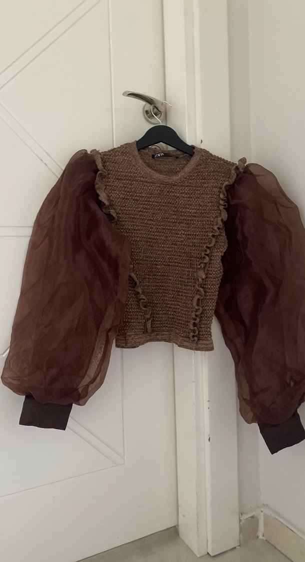 Kahverengi triko bluz, uzun, hacimli tül kollar ve yuvarlak yaka ile rahat, sokak stili sunar. Günlük kullanıma uygundur.