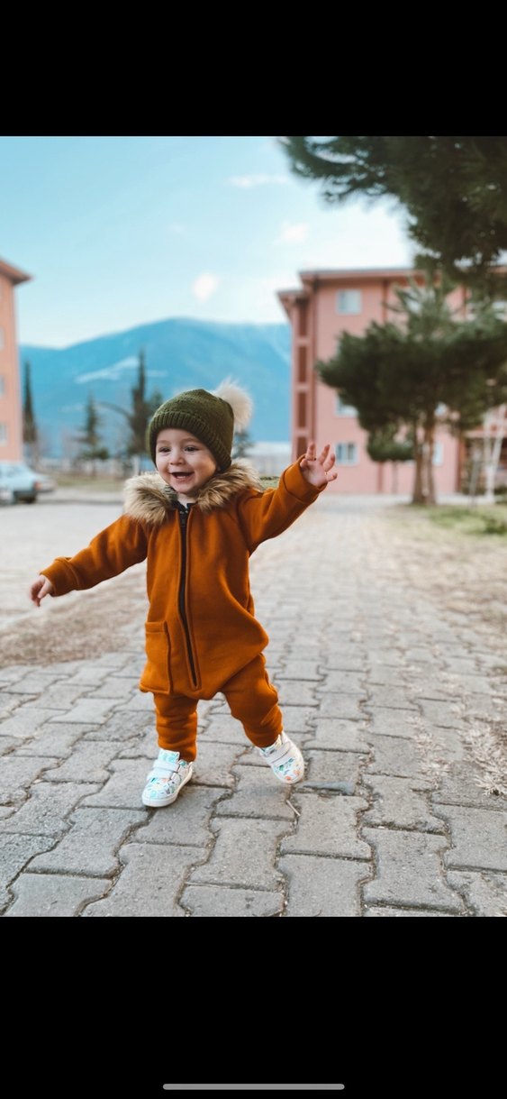 Kahverengi, parlak ve kürk detaylı kapüşonlu, yumuşak ve sıcak dokulu tulum . Hiçbir sorunu yok. 2 yaştan 3,5 yaşa kadar rahat olur