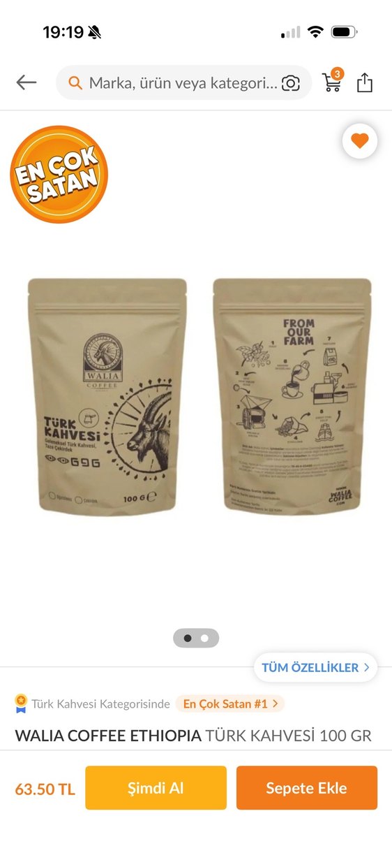 100g Türk kahvesi içeren kahverengi ambalaj. Ön yüzünde geleneksel desenler, arka yüzünde kullanım talimatları bulunur. ☕