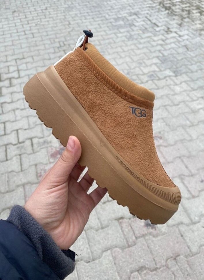 Kahverengi dolgu topuklu terlikler, kauçuk taban ve yumuşak tüylü detaylarla rahatlık ve trend sokak stilini bir araya getirir.