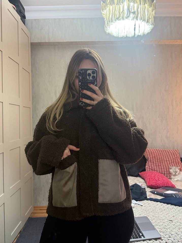 Kadın ceket, bol kesim, yakalı ve uzun kolludur. Yumuşak, sıcak kumaş ve tüylü detaylar ile ceplerinde parlak kumaş bulunur. Günlük sokak stili için uygundur.