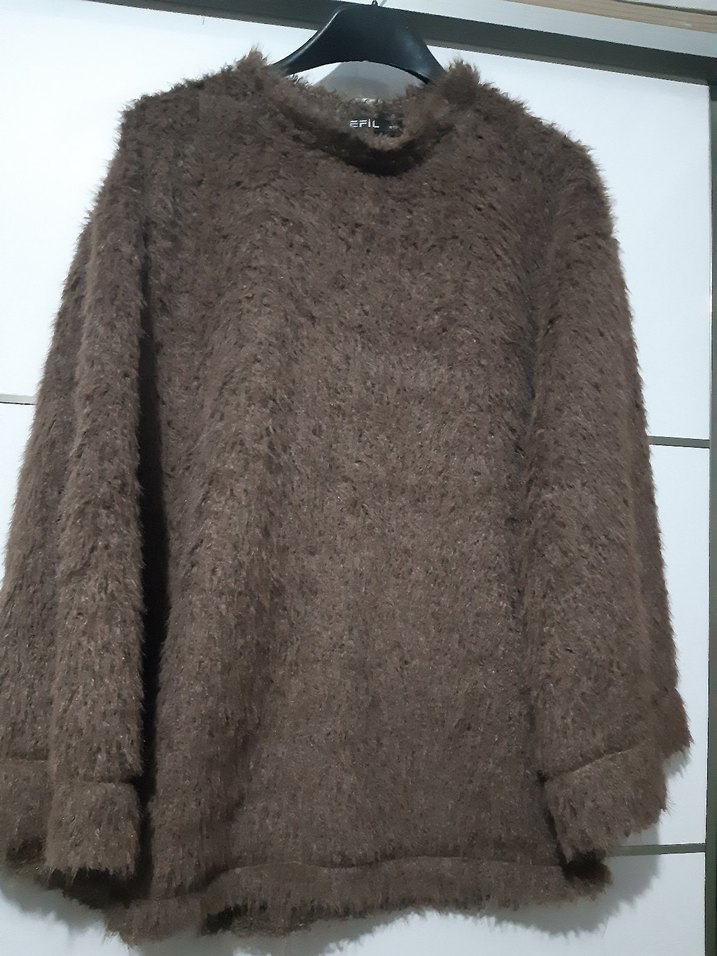 Kahverengi, yuvarlak yaka ve uzun kollu, yumuşak ve sıcak kumaştan yapılmış kadın sweatshirtü. Rahat kesimi ve sade tarzıyla günlük kullanıma uygundur.