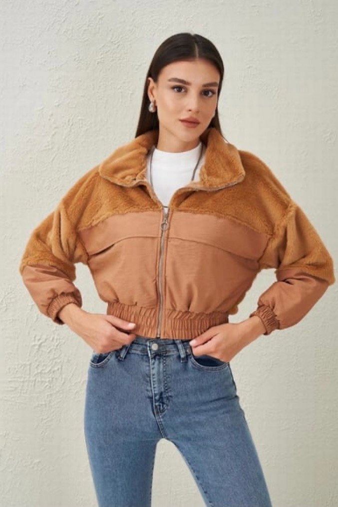 Kahverengi süet kumaştan, tüylü detaylı, kısa ve bol kesim ceket. Bisiklet yaka ve uzun kolludur, parlak dokusuyla gündelik sokak stiline uygundur.