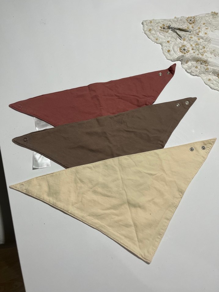 Koyu kahverengi, toprak tonları ve krem renklerde üçgen şekilli, çıtçıtlı ve desensiz bebek önlükleri seti. Rahat ve kullanışlıdır.