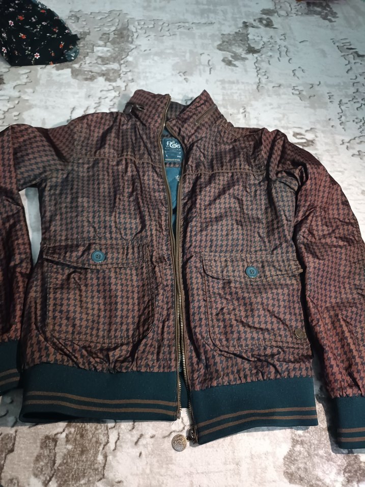 Düğmeli cepleri ve kırçıllı kahverengi deseni , uzun kollu, unisex için dar kesim ceket. Etikette l beden yazıyor ama s-m daha güzel olur