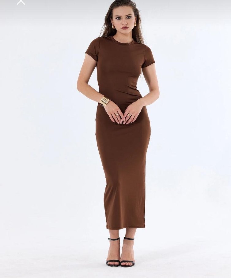 Koyu kahverengi, dar kesim uzun elbise, kısa kollu ve yuvarlak yaka detaylarıyla günlük kullanıma uygun, yalın ve modern bir şıklık sunar. LİKRALI KUMAŞTIR.