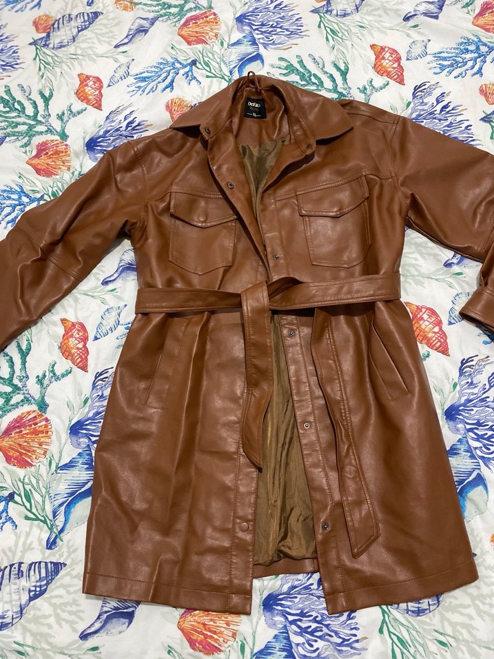 Kahverengi uzun deri ceket, kemerli . Hic bir sorunu yok bir Mevsim giyildi sayili giyindi zayfladigim icn satmaya kadar verdim.