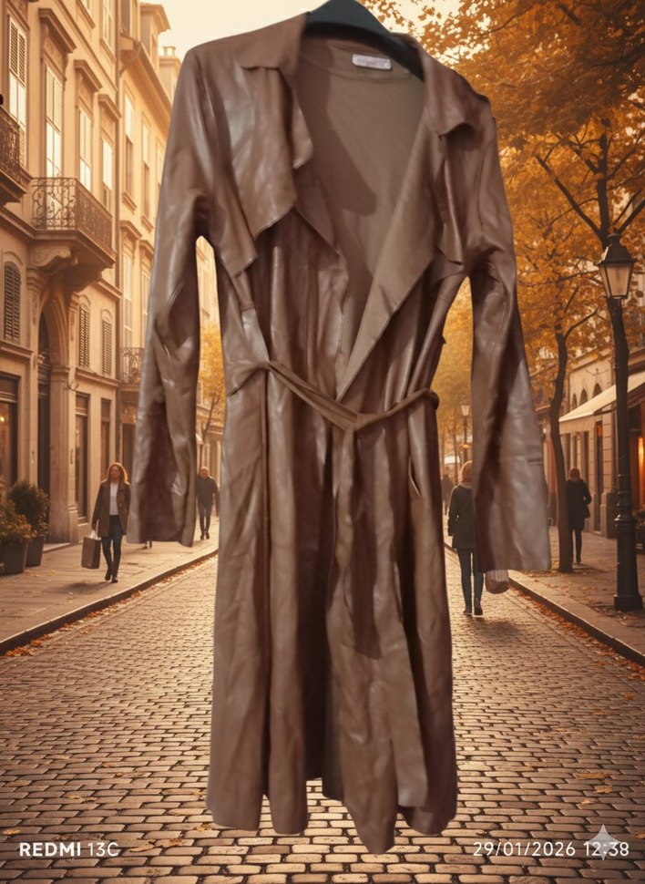 Kahverengi uzun ince deri trençkot, kemerli ve keskin yaka detaylıdır. Uzun kollu, rahat kesimle şık bir sokak tarzı sunar.kusurları bir kol kısmında küçük dökülme var dericide yaparım değerlenririm diyene bir ürün alana hediye olarak yollar ım