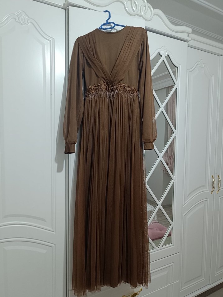 Kahverengi, uzun boy, V yakalı, drapeli ve bol kesim abiye elbise. Uzun kollu ve bel detayı ile düğünler için uygun.
