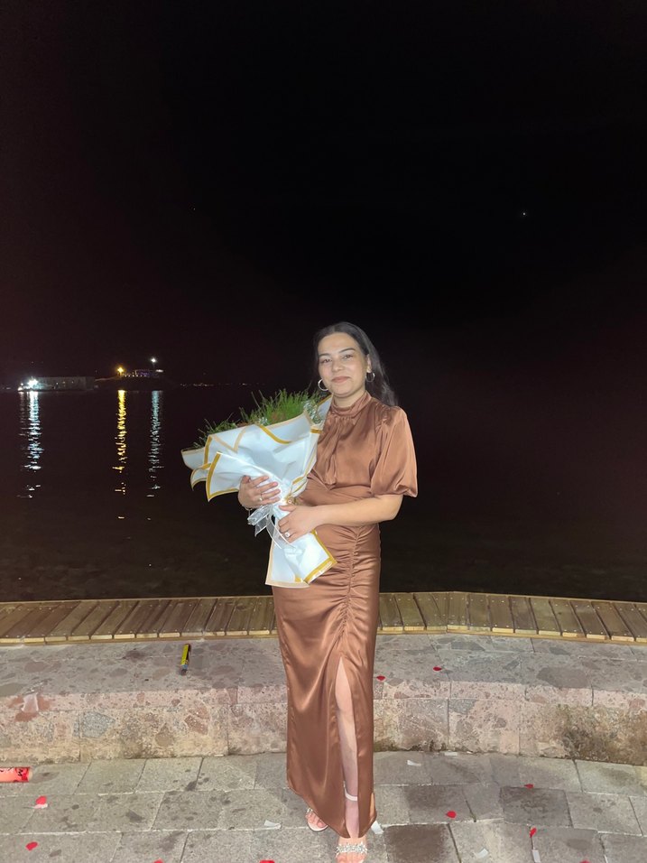 Kahverengi uzun elbise, drapeli tasarım, halter yaka ve kısa kollu. 36-38 bedenlere tam olur