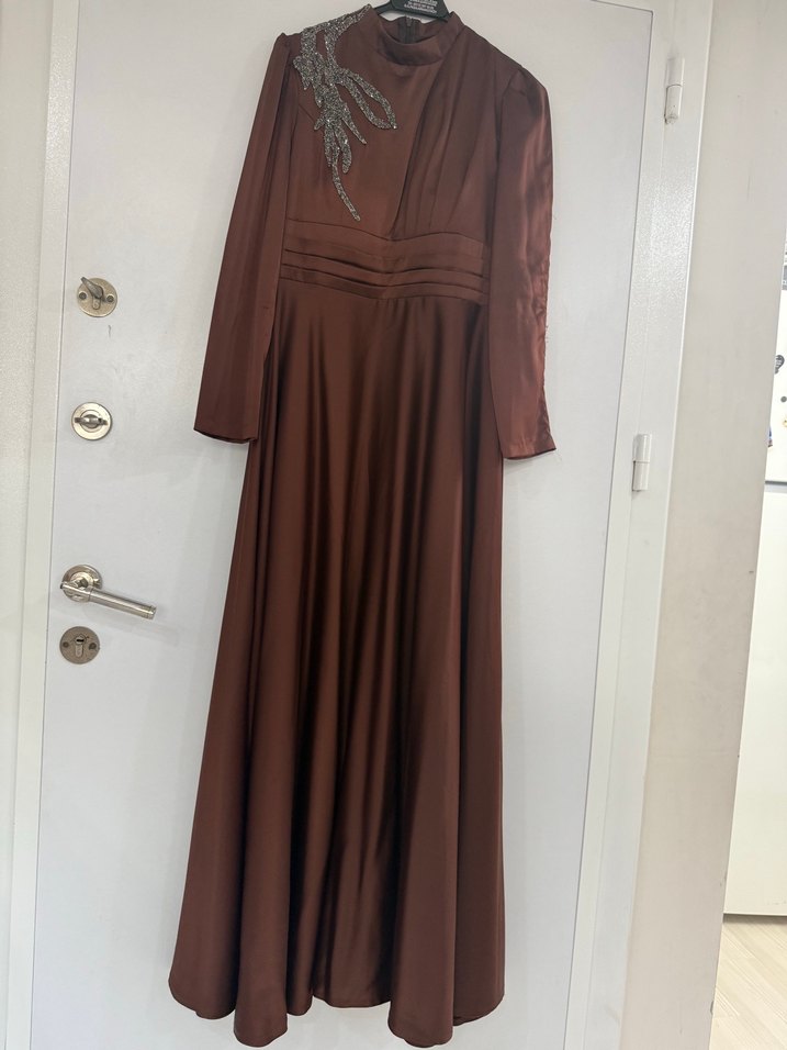 Kahverengi Uzun Drapeli Kadın Abiye Elbise