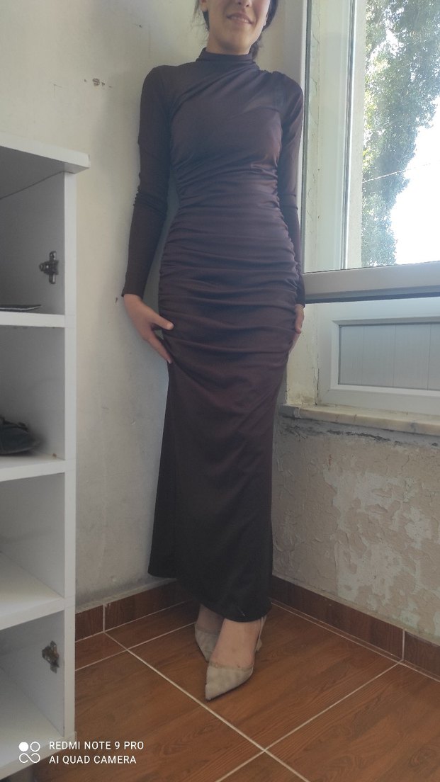 Kahverengi, uzun, drapeli ve vücuda oturan bu elbise, yüksek yakalı ve uzun kolludur. İpeksi kumaştan yapılmıştır, romantik akşamlar için uygundur.