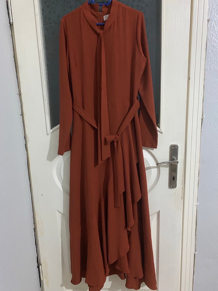 Kahverengi uzun elbise, yüksek yakalı ve uzun kolludur. Drapeli tasarımı ve regular kesimi ile sade ve rahat bir görünüm sunar. Yumuşak sentetik kumaştan üretilmiştir.