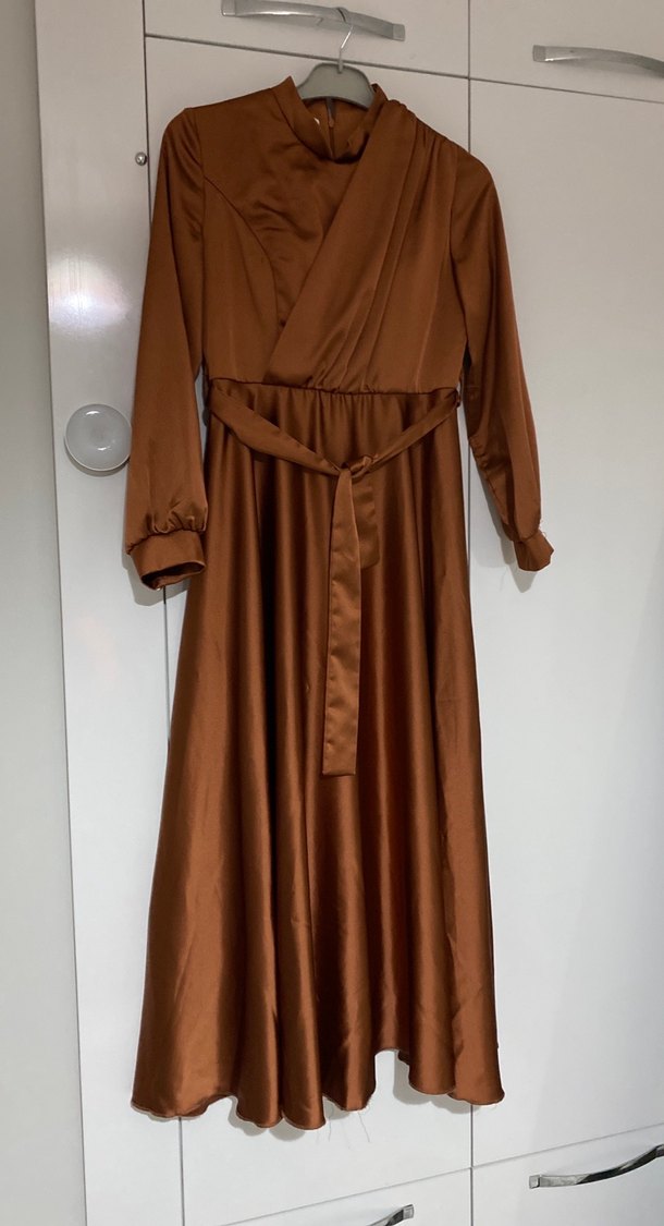 Kahverengi Uzun Drapeli Kadın Elbise M bedene uygun