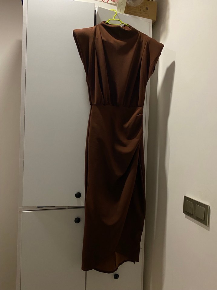 Kahverengi uzun elbise, yüksek yakalı ve drapeli tasarıma sahip. İpek gibi kumaştan, kolsuz ve romantik akşamlar için uygun. Minimalist, çağdaş stil sunar.