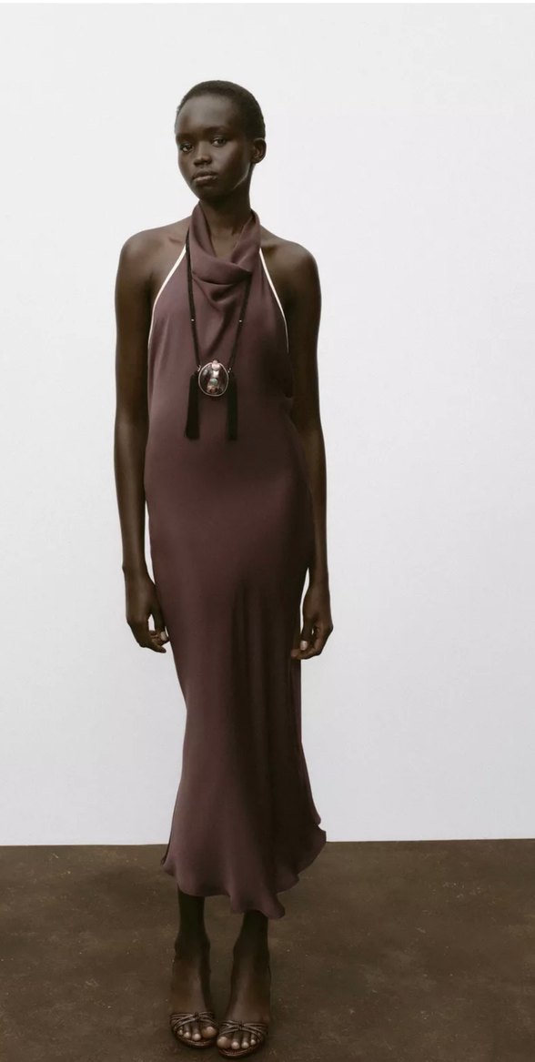 Kahverengi, kolsuz uzun elbise, halter yaka ve drapeli detaylara sahiptir. İpeksi kumaştan yapılmış, vücuda oturan kesimi ve çağdaş tarzıyla günlük kullanıma uygundur.