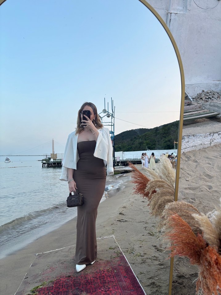 Kahverengive straplez uzun elbise, sade ve şık tasarımıyla günlük kullanıma uygundur. Trendy, rahat Paris tarzını yansıtır.