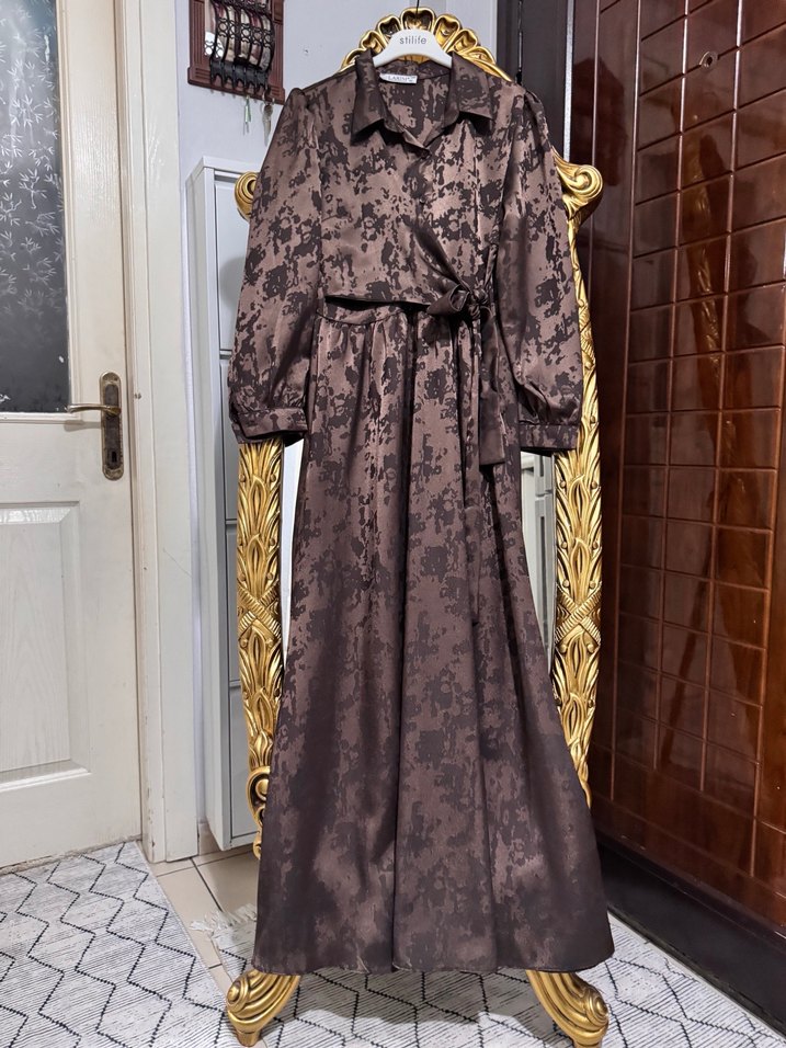 Kahverengi, ipek görünümlü uzun elbise, bol kesim ve yakalı. İnce bağlama desenli, drapeli, askılı kollu, ofis için modern klasik tarzda. ✨ çok şık bir elbisedir 40 yazıyor ama 38 e daha uygun olur diye düşünüyorum uzun zayıf 40 bedenede olabilir
