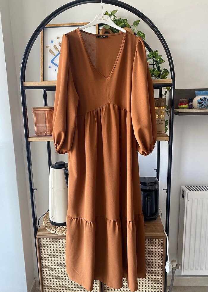 Kahverengi salaş şık bir elbisedir. Temiz kullanıldı, defosuzdur. Boyu 119 cm dir.