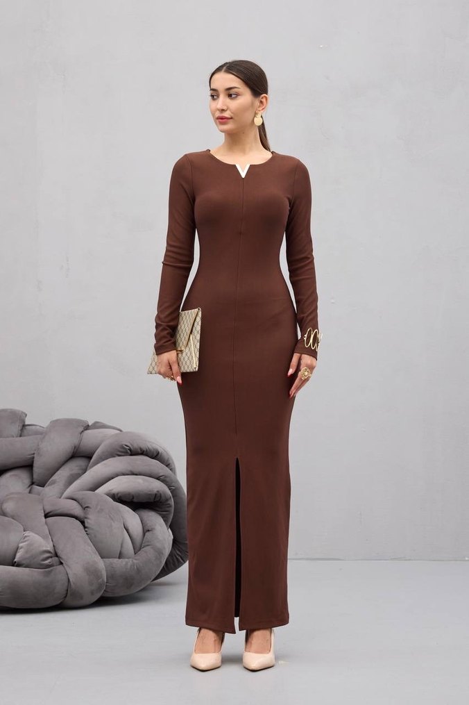 Kahverengi, uzun elbise, uzun kollu ve V yaka detaylıdır. Minimalist ve şık tasarımıyla günlük kullanıma uygundur.