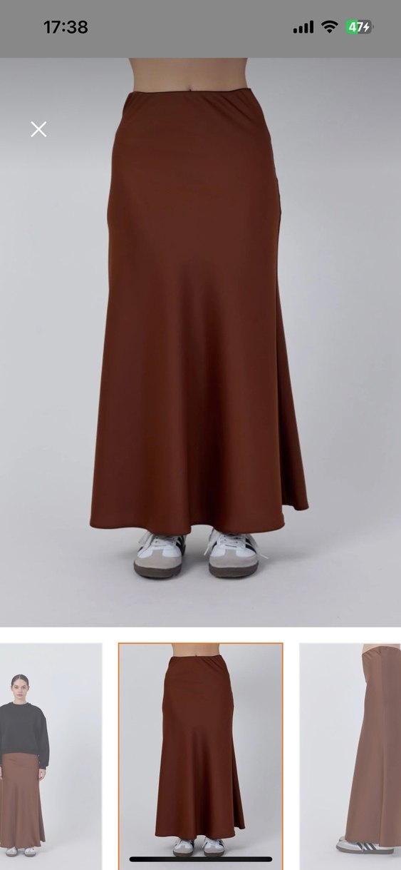 koyu kahverengi uzun etek, düzenli kesim ve pürüzsüz sentetik kumaş ile günlük kullanıma uygun, zahmetsiz şıklık sunar.