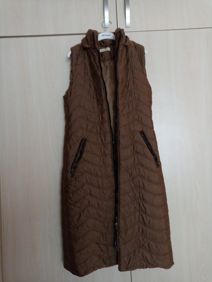 Kahverengi, uzun ve dar kesim yelek, askısız yakaya sahip. Sentetik kumaştan üretilmiş, fermuarlı cepler içerir, trend sokak stili için uygun fiyat 120 tl.pazarlik payı vardır
