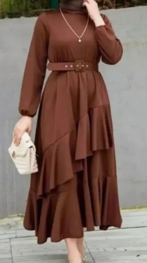 Kahverengi uzun elbise, yüksek yakalı ve fırfırlı detaylara sahip. Salaş ve modest kesimi, ince askılı kollarıyla günlük kullanıma uygundur. Bir kere giyildi.