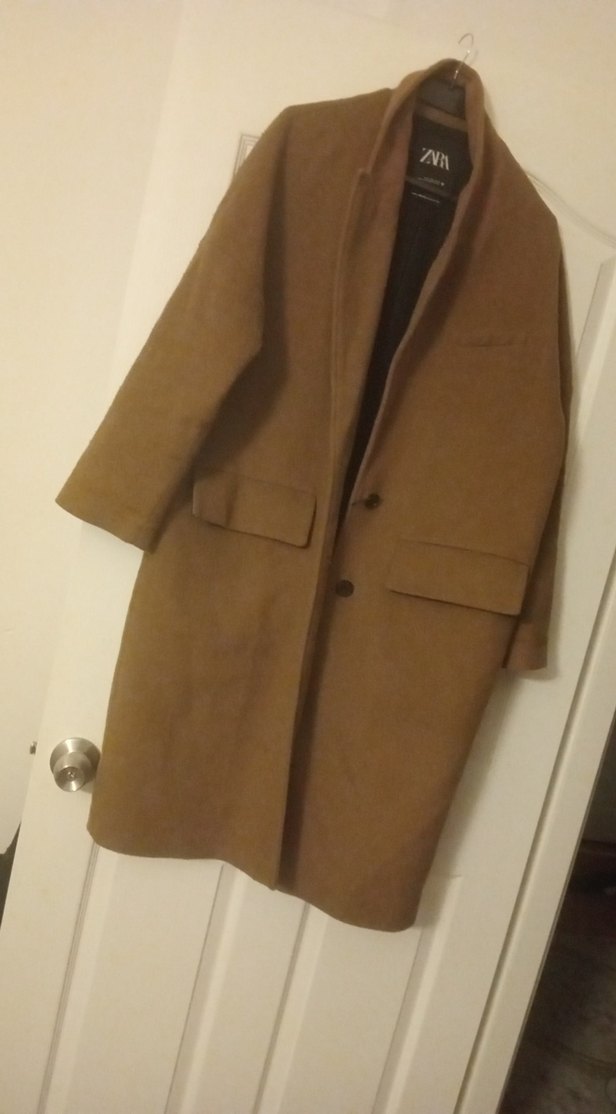 Kahverengi uzun kaban, yumuşak dokulu ve sade tasarımlı. Önünde cepler ve düğmeli kapanışı bulunur.